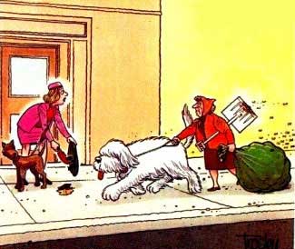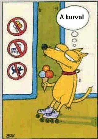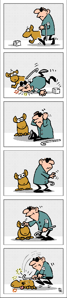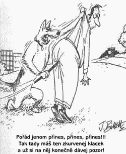Panička se ohne k pejskovi, chce ho pohladit. Raf a půlka rukávu pryč, trocha krve by se taky našla. Paní se začne rozčilovat: "Pane, vždyť jste říkal, že váš pes nekouše!"